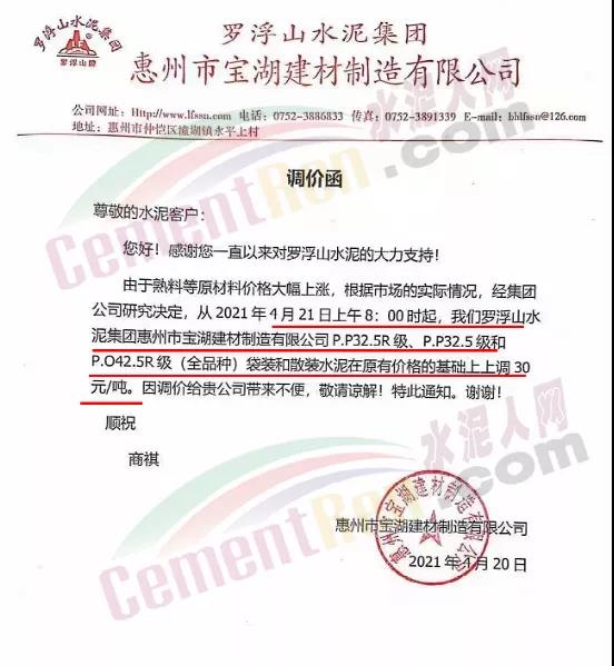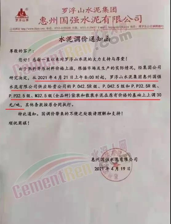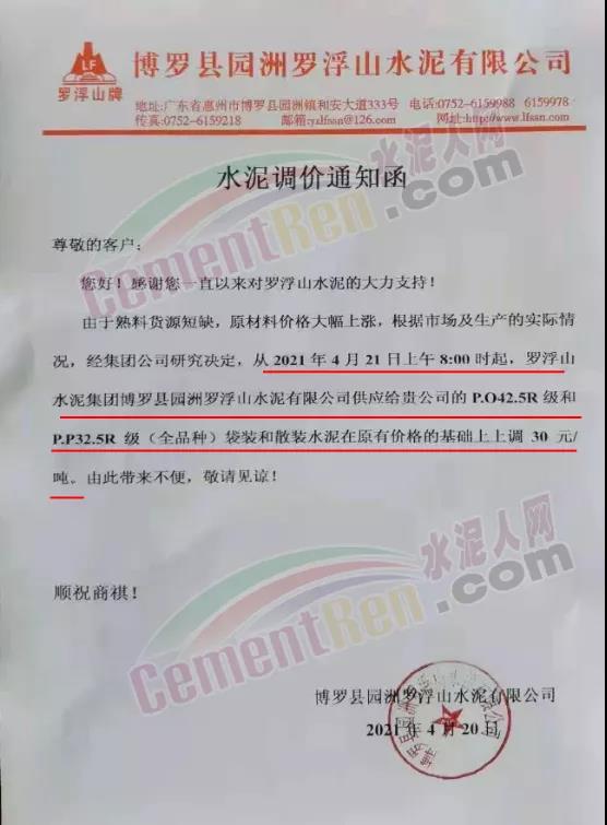 博羅縣園洲羅浮山水泥有限公司羅浮山牌通知由于熟料貨源短缺,原材料價格大幅上漲,根據(jù)市場及生產(chǎn)的實(shí)際情況,經(jīng)集團(tuán)公司研究決定,從4月21日上午8時起,公司P.O42.5R級和P.P32.5R級(全品種)袋裝和散裝水泥在原有價格的基礎(chǔ)上上調(diào)30元/噸。
