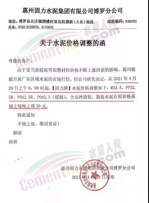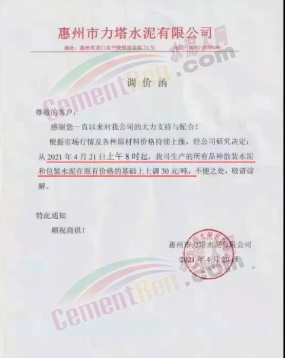 惠州市力塔水泥有限公司通知根據(jù)市場行情及各種原材料價格持續(xù)上漲,經(jīng)公司研究決定從4月21日上午8時起,公司生產(chǎn)的所有品種散裝水泥和包裝水泥在原有價格的基礎(chǔ)上上調(diào)30元/噸。