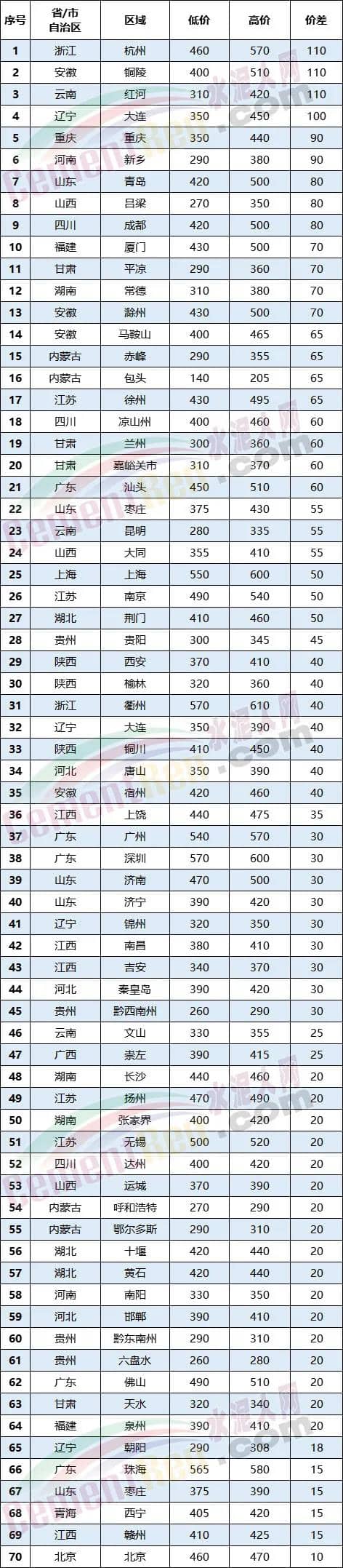 受兩大核心區(qū)域漲價輻射影響,相鄰區(qū)域紛紛發(fā)函上調(diào)水泥熟料價格。在一片漲價聲中,有一些不和諧的聲音。因部分企業(yè)未落實(shí)漲價,令區(qū)域內(nèi)出現(xiàn)不小的價格差。從水泥人網(wǎng)信息中心重點(diǎn)監(jiān)控的70個地區(qū)來看,價差最高的區(qū)域?yàn)檎憬贾?、安徽銅陵、云南紅河、遼寧大連等區(qū)域,價差在100元/噸左右,最高價差在110元/噸左右。