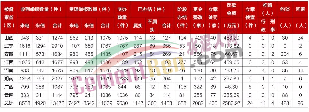 日前,水泥人網從生態(tài)環(huán)境部獲悉,第二輪第三批中央生態(tài)環(huán)境保護督察進入下沉工作階段。截至4月19日晚20:00,各督察組共收到群眾來電、來信舉報13478件,受理有效舉報11039件,經梳理合并重復舉報,累計向被督察單位轉辦9630件。據了解,上述舉報中涉及海螺水泥、華新水泥、紅獅水泥、冀東水泥、同力水泥、萬年青水泥等多家水泥企業(yè)。