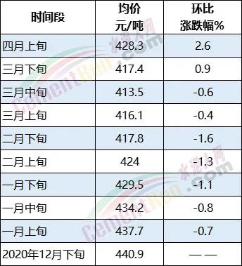 以PO42.5散裝水泥為例,國(guó)家統(tǒng)計(jì)局?jǐn)?shù)據(jù)顯示:2020年末PO42.5散裝水泥均價(jià)為440.9元/噸,一月上旬出現(xiàn)小幅下跌至437.7元/噸,四月上旬均價(jià)為428.3元/噸,四月上旬環(huán)比一月上旬報(bào)價(jià)降幅為2.15%。三月下旬到四月上旬漲幅為2.6%。