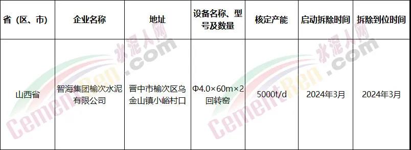 退出產(chǎn)能情況顯示,智海集團榆次水泥有限公司退出位于晉中市榆次區(qū)烏金山鎮(zhèn)小峪村的Φ4.0×60m×2回轉(zhuǎn)窯(核定產(chǎn)能5000t/d)并將于2024年3月啟動拆除。