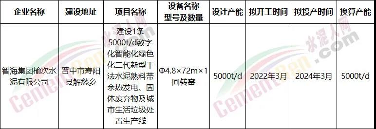 建設(shè)項目情況顯示,智海集團榆次水泥有限公司將在晉中市壽陽縣解愁鄉(xiāng)區(qū)域內(nèi)建設(shè)1條5000t/d數(shù)字化智能化綠色化二代新型干法水泥熟料帶余熱發(fā)電、固體廢棄物及城市生活垃圾處置生產(chǎn)線, 關(guān)鍵設(shè)備為Φ4.8×72m×1回轉(zhuǎn)窯(設(shè)計產(chǎn)能5000t/d)擬開工時間2022年3月,并將于2024年3月投產(chǎn),置換比例1:1。