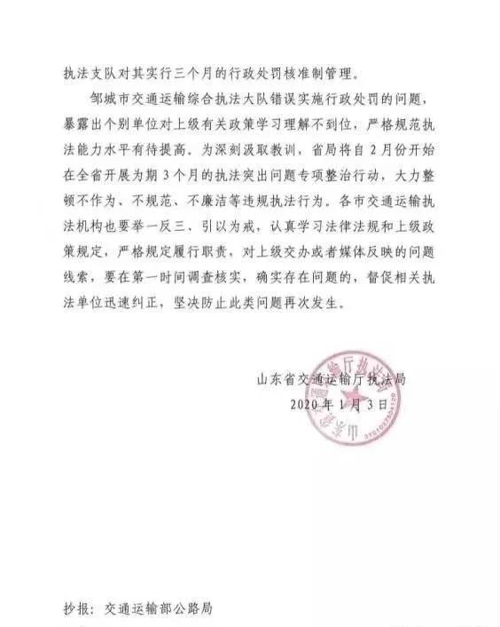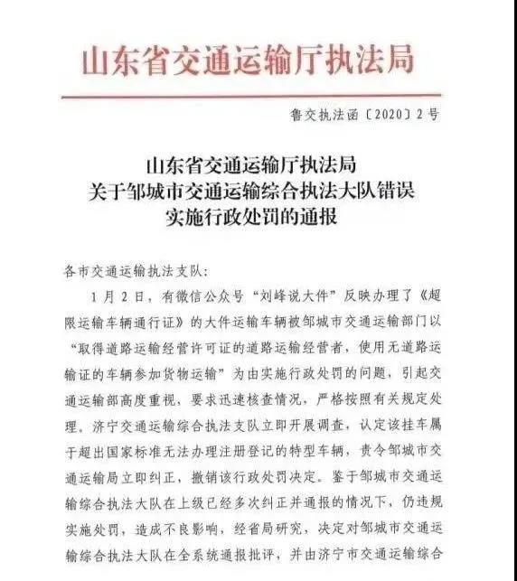 2020年1月3日,山東省交通運(yùn)輸廳執(zhí)法局下發(fā)了《關(guān)于鄒城市交通運(yùn)輸綜合執(zhí)法大隊(duì)錯(cuò)誤實(shí)施行政處罰的通報(bào)》(魯交執(zhí)法函〔2020〕2號(hào))。1月6日,劍群公司接到了鄒城市交通運(yùn)輸局簽發(fā)的《撤銷案件決定書》,退還罰款8000元。至此,該案宣告銷案。