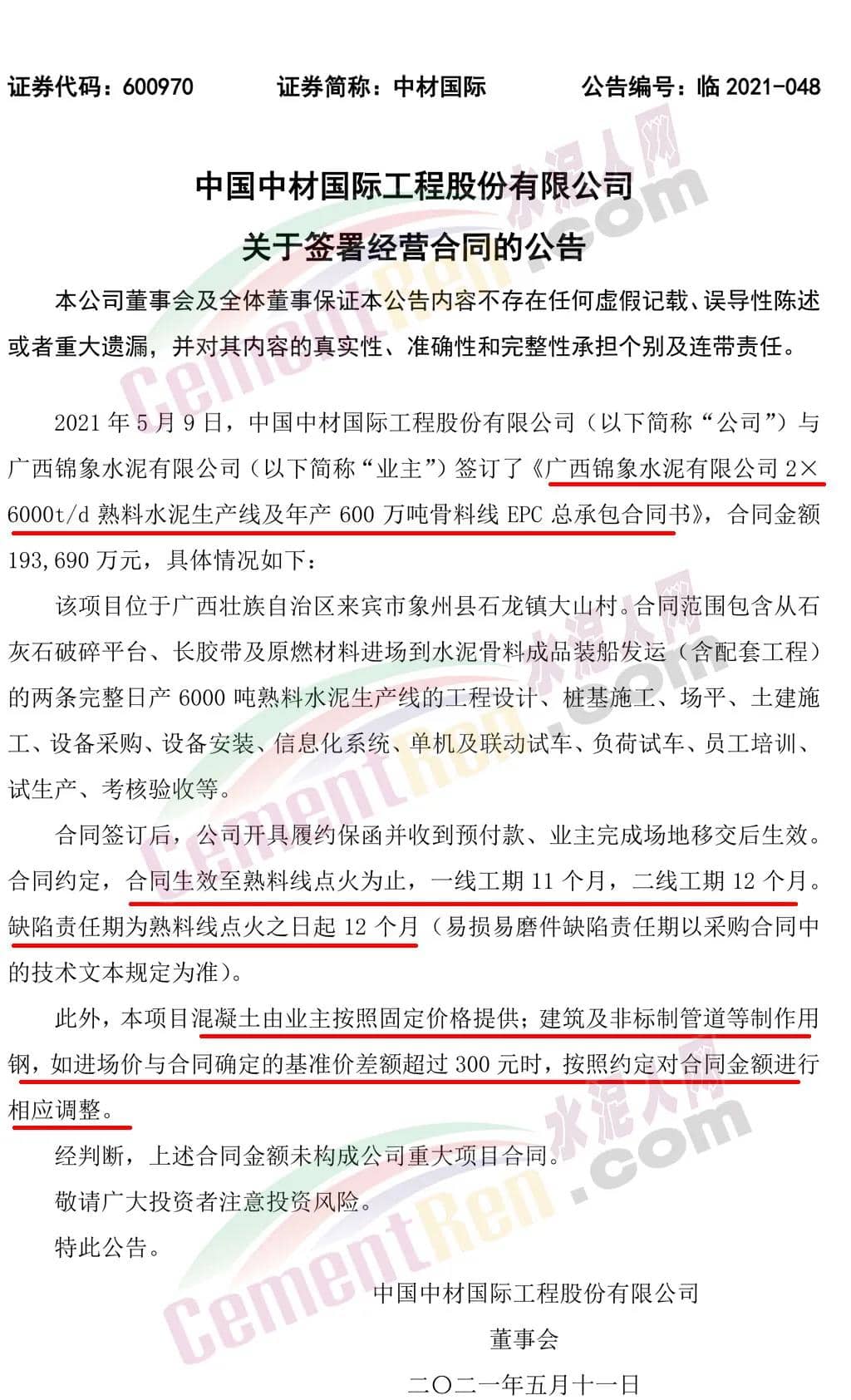 中材國(guó)際5月10日晚間公告稱,2021年5月9日,中國(guó)中材國(guó)際工程股份有限公司與廣西錦象水泥有限公司簽訂了《廣西錦象水泥有限公司2×6000t/d熟料水泥生產(chǎn)線及年產(chǎn)600萬(wàn)噸骨料線EPC總承包合同書》,合同金額193,690萬(wàn)元。