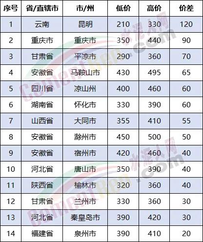 重點(diǎn)監(jiān)控省市自治區(qū)PO42.5散裝水泥價差一覽