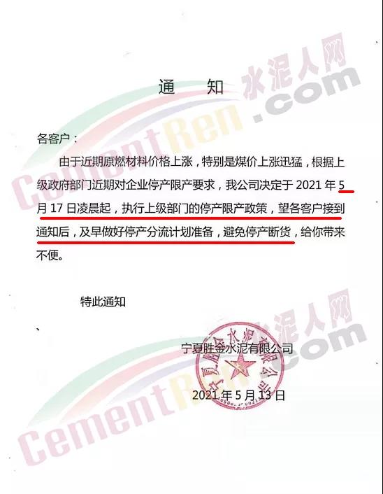 水泥人網(wǎng)通訊員消息:5月13日,寧夏勝金水泥有限公司通知,由于近期原燃材料價(jià)格上漲,特別是煤價(jià)上漲迅猛,根據(jù)上級(jí)政府部門近期對(duì)企業(yè)停產(chǎn)限產(chǎn)要求,公司決定于2021年5月17日凌晨起,執(zhí)行上級(jí)部門的停產(chǎn)限產(chǎn)政策,望各客戶接到通知后,及早做好停產(chǎn)分流計(jì)劃準(zhǔn)備,避免停產(chǎn)斷貨。