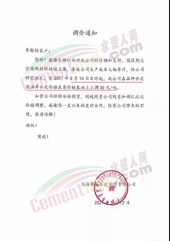同日,烏海賽馬有限責(zé)任公司通知,因近期大宗原燃材料持續(xù)上漲,導(dǎo)致公司生產(chǎn)成本大幅攀升,經(jīng)公司研究決定,自2021年5月14日0時(shí)起,各品種水泥及油井水泥價(jià)格在原價(jià)格基礎(chǔ)上上調(diào)30元/噸。