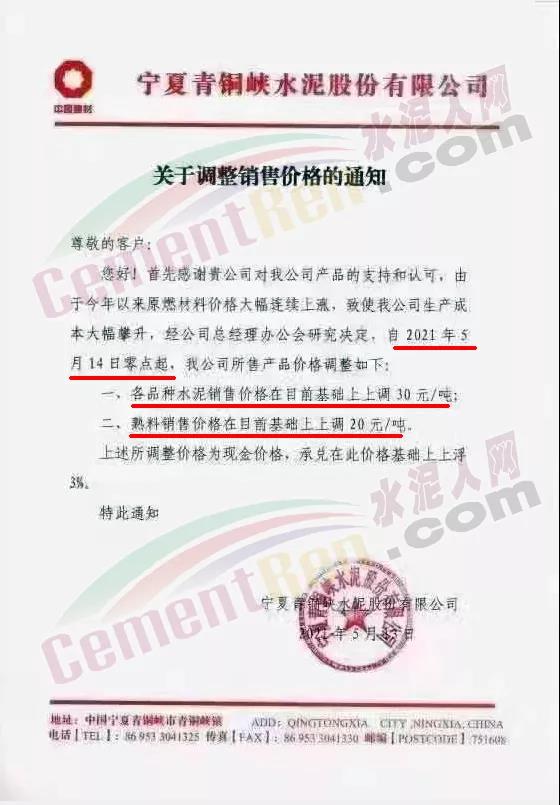 寧夏青銅峽水泥股份有限公司通知由于今年以來(lái)原燃材料價(jià)格大幅連續(xù)上漲,致使公司生產(chǎn)成本大幅攀升,經(jīng)公司總經(jīng)理辦公會(huì)研究決定,自2021年5月14日零點(diǎn)起,各品種水泥銷售價(jià)格在目前基礎(chǔ)上上調(diào)30元/噸;熟料銷售價(jià)格在目前基礎(chǔ)上上調(diào)20元/噸。上述所調(diào)整價(jià)格為現(xiàn)金價(jià)格,承兌在此價(jià)格基礎(chǔ)上上浮3%。