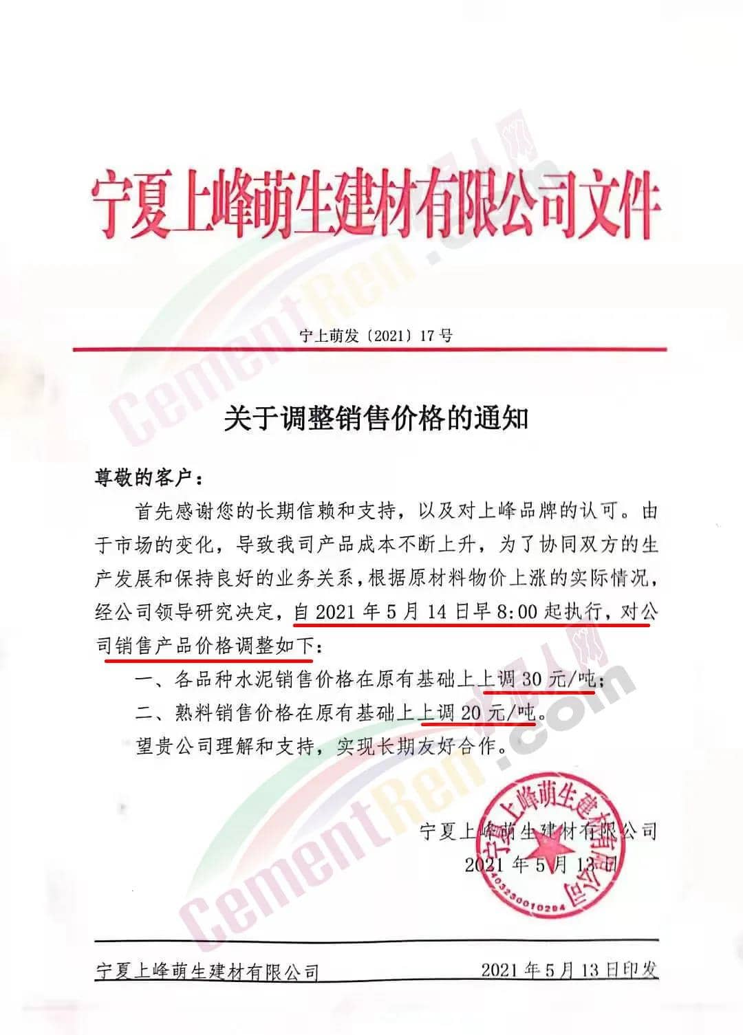 寧夏上峰萌生建材有限公司通知由于市場(chǎng)的變化,導(dǎo)致公司產(chǎn)品成本不斷上升,為了協(xié)同雙方的生產(chǎn)發(fā)展和保持良好的業(yè)務(wù)關(guān)系,根據(jù)原材料物價(jià)上漲的實(shí)際情況,經(jīng)公司領(lǐng)導(dǎo)研究決定,自2021年5月14 日早8∶00 起執(zhí)行,對(duì)公司各品種水泥銷售價(jià)格在原有基礎(chǔ)上上調(diào) 30 元/噸;熟料銷售價(jià)格在原有基礎(chǔ)上上調(diào) 20 元/噸。
