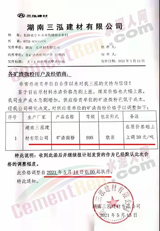 同期,湖南多家礦粉企業(yè)通知上調(diào)礦粉價(jià)格。湖南三泓建材有限公司通知稱因原材料價(jià)格不斷上漲,成本急劇增加,經(jīng)公司研究決定,從2021年5月14日開始,對(duì)所有區(qū)域礦粉價(jià)格在原來(lái)基礎(chǔ)上上調(diào)30元/噸。