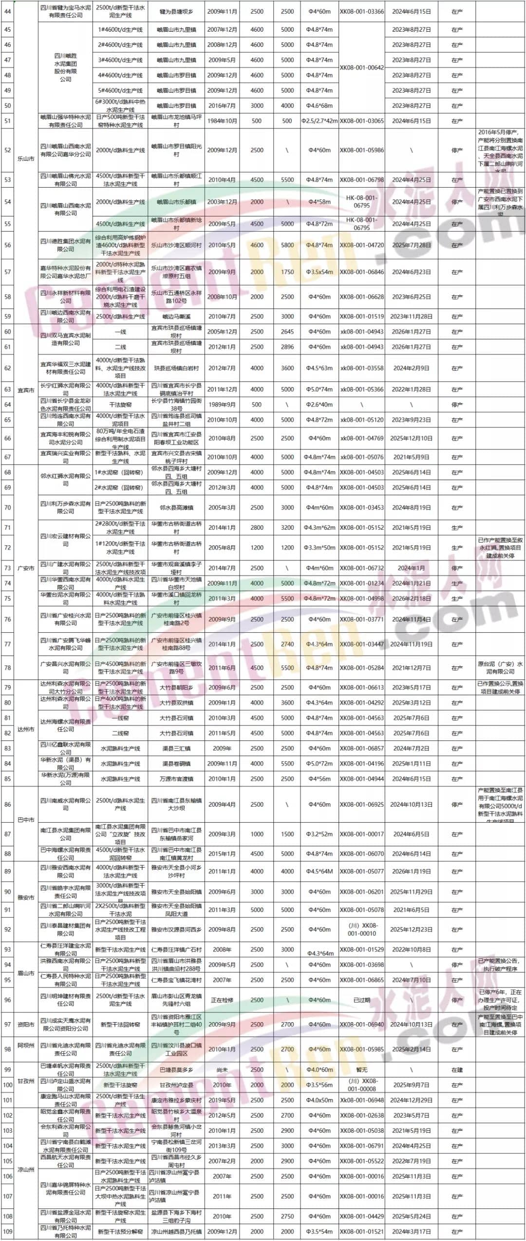 5月18日,四川省經(jīng)濟(jì)和信息化廳發(fā)布了《關(guān)于四川省水泥熟料和平板玻璃生產(chǎn)線清單的公示》,公示顯示,截止到2020年12月31日,四川省共有109條水泥熟料生產(chǎn)線,合計(jì)產(chǎn)能9921.93萬噸,其中10條停產(chǎn),1條在建。