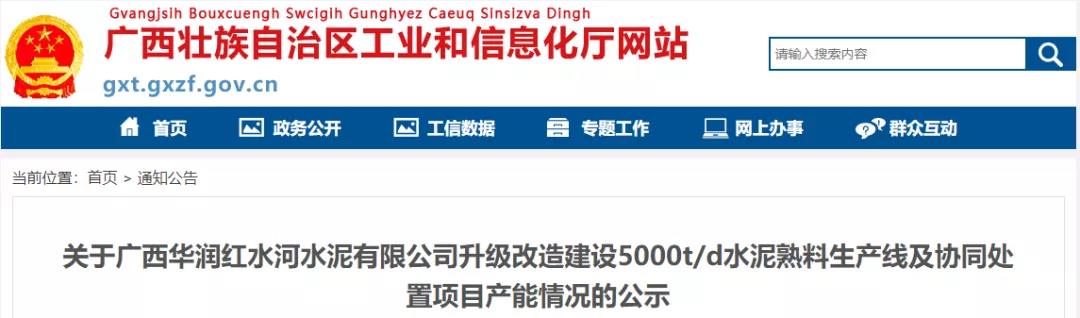 日前,廣西壯族自治區(qū)工業(yè)和信息化廳發(fā)布《關(guān)于廣西華潤(rùn)紅水河水泥有限公司升級(jí)改造建設(shè)5000t/d水泥熟料生產(chǎn)線及協(xié)同處置項(xiàng)目產(chǎn)能情況的公示》稱,按照相關(guān)通知要求,將廣西華潤(rùn)紅水河水泥有限公司升級(jí)改造建設(shè)5000t/d水泥熟料生產(chǎn)線及協(xié)同處置項(xiàng)目產(chǎn)能情況進(jìn)行公示,具體公式如下: