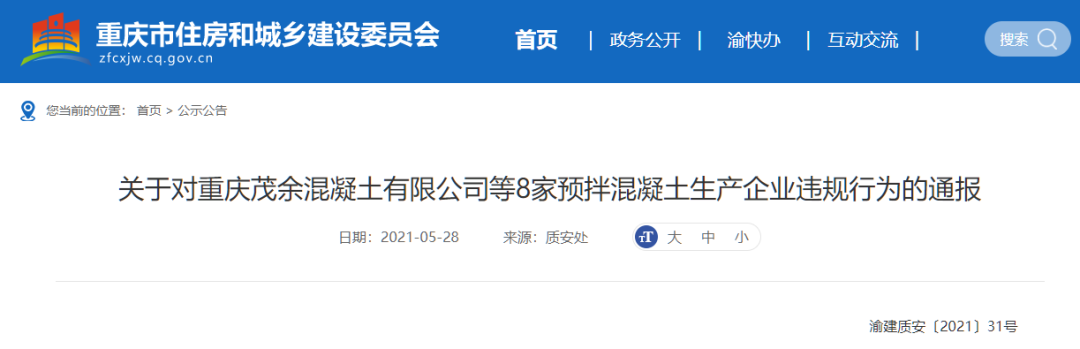 重慶茂余混凝土有限公司、重慶市城投混凝土有限公司、重慶華冠混凝土有限公司、重慶三圣實(shí)業(yè)股份有限公司、重慶首溪建材有限公司、重慶鐵川混凝土工程有限公司、重慶建典混凝土有限公司、重慶遠(yuǎn)立新型建材有限公司等8家預(yù)拌混凝土生產(chǎn)企業(yè)未切實(shí)履行生產(chǎn)質(zhì)量責(zé)任,未按相關(guān)法律、法規(guī)和工程建設(shè)強(qiáng)制性標(biāo)準(zhǔn)開展預(yù)拌混凝土質(zhì)量控制工作,予以全市通報(bào)批評,記入不良信用信息六個(gè)月。