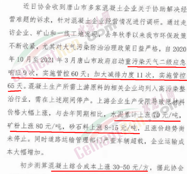 上月唐山市商品混凝土行業(yè)協(xié)會曾發(fā)布《倡議書》稱,自2020年10月至2021年3月唐山市政府啟動重污染天氣二級應(yīng)急響應(yīng)9次,實(shí)施管控60 天;加大減排力度11次,實(shí)施管控65天。