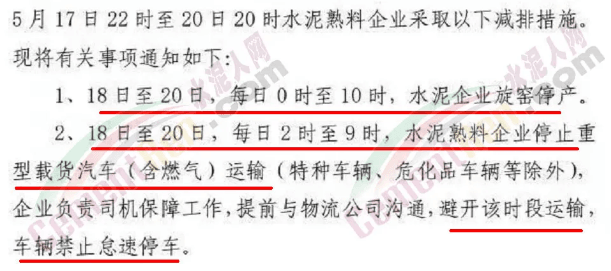 5月17日22時至20日20時水泥熟料企業(yè)采取停產(chǎn),停運(yùn)措施。