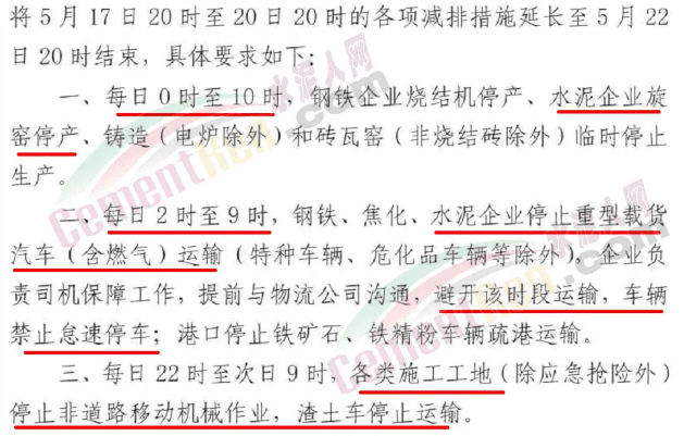 與本次管控要求類似的管控文件,上個月唐山地區(qū)曾連發(fā)五文。5月21日20時-22日10時,水泥企業(yè)旋窯停止生產(chǎn);5月21日22時-22日10時,水泥企業(yè)停止重型載貨汽車運(yùn)輸,提前與物流公司溝通,避開該時段運(yùn)輸,車輛禁止怠速停車。