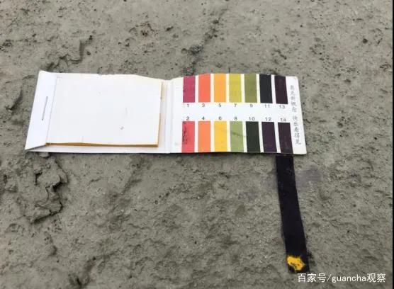 6月2日,在天津市靜海區(qū)調(diào)查時(shí)發(fā)現(xiàn),位于同合公司廠(chǎng)區(qū)緊鄰的路邊,在路邊上有一片,充斥著大量的水泥結(jié)塊、灰渣,大量被傾倒后已經(jīng)凝固的混凝土漿還保留著之前的流動(dòng)形態(tài)?;炷翝{中的水分滲出后,都聚在路邊的低洼處。在剛傾倒過(guò)不久的一堆混凝土漿中,經(jīng)PH試紙檢測(cè)顯示其濃度堿液PH值在13—14左右。