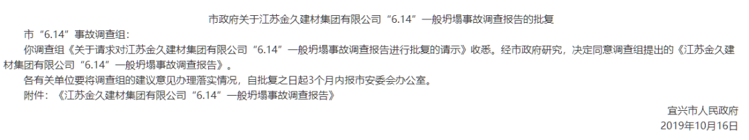 經(jīng)調(diào)查認(rèn)定,江蘇金久建材集團(tuán)有限公司“6.14”坍塌事故是一起一般生產(chǎn)安全責(zé)任事故。