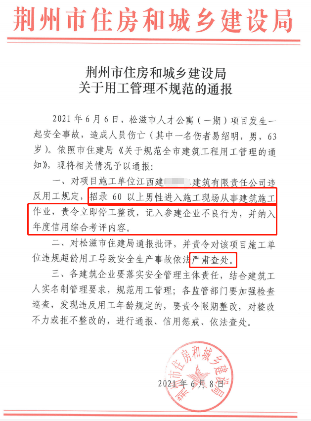 2021年6月6日,荊州市一項(xiàng)目發(fā)生一起安全事故,造成人員傷亡(其中一名傷者男,63歲)。依照市住建局《關(guān)于規(guī)范全市建筑工程用工管理的通 知》,將相關(guān)情況予以通報(bào):