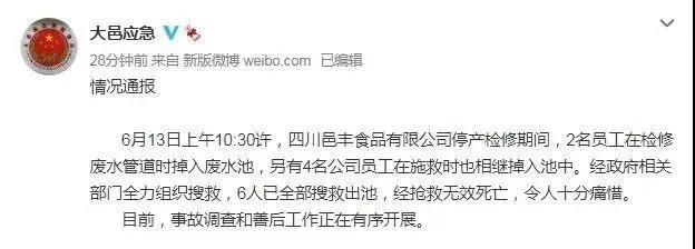 據(jù)大邑縣應(yīng)急管理局通報(bào),6月13日上午10:30許,四川邑豐食品有限公司停產(chǎn)檢修期間,2名員工在檢修廢水管道時(shí)掉入廢水池,另有4名公司員工在施救時(shí)也相繼掉入池中。經(jīng)政府相關(guān)部門全力組織搜救,6人已全部搜救出池,經(jīng)搶救無(wú)效死亡,令人十分痛惜。目前,事故調(diào)查和善后工作正在有序開(kāi)展。