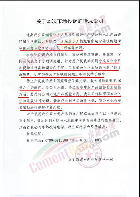 公司承諾:待江西省建材產(chǎn)品監(jiān)督檢測(cè)站鑒定后,若是分宜海螺水泥產(chǎn)品質(zhì)量問題,企業(yè)將按照國(guó)家相關(guān)法律法規(guī)進(jìn)行處理;若非企業(yè)產(chǎn)品質(zhì)量問題,分宜海螺也會(huì)積極幫助進(jìn)行瓷磚恢復(fù)處理。