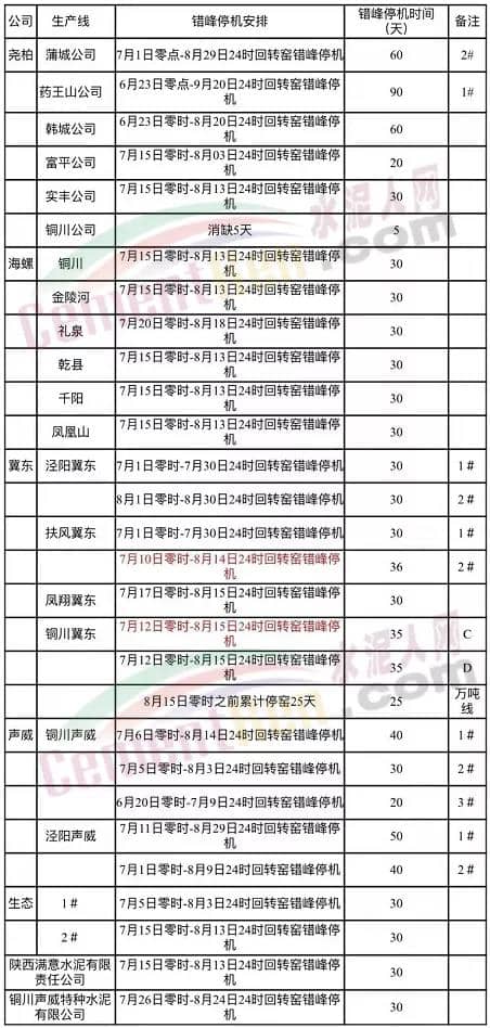《通知》結(jié)合陜西省水泥行業(yè)運(yùn)行規(guī)律和各企業(yè)實(shí)際情況制定了具體的“水泥熟料生產(chǎn)線錯(cuò)峰生產(chǎn)計(jì)劃表”,要求關(guān)中地區(qū)堯柏、海螺、冀東、聲威等29條水泥熟料生產(chǎn)線自6月20日零時(shí)起安排錯(cuò)峰停產(chǎn),最高停產(chǎn)90天。各企業(yè)要嚴(yán)格按照計(jì)劃執(zhí)行,無特殊情況,不得對(duì)計(jì)劃時(shí)間進(jìn)行調(diào)整。水泥人網(wǎng)注意到文件要求銅川冀東萬噸線于8月15日零時(shí)之前累計(jì)停窯25天。