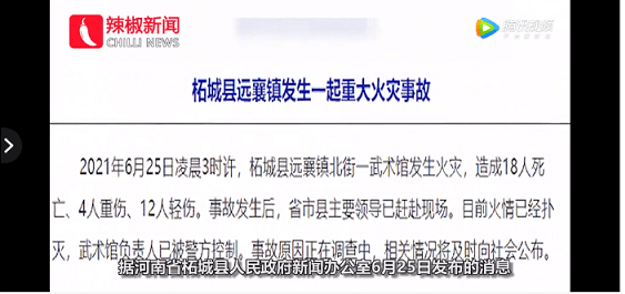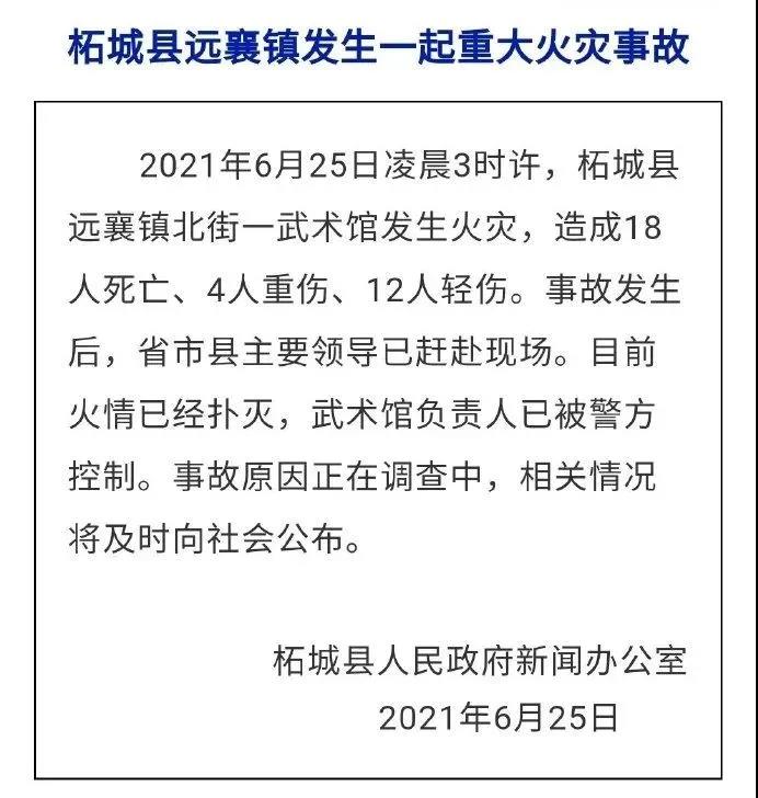 6月25日,柘城縣遠(yuǎn)襄鎮(zhèn)北街一武術(shù)館發(fā)生重大火災(zāi),目前已造成18人死亡,6人重傷、10人輕傷。傷亡人員均為武術(shù)館培訓(xùn)人員。