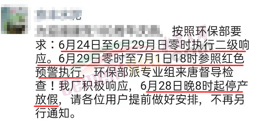 日前,唐山一家水泥企業(yè)發(fā)通知稱,按照環(huán)保部門要求:6月24日至6月29日零時執(zhí)行二級響應。6月29日零時至7月1日18時參照紅色預警執(zhí)行,環(huán)保部門派專業(yè)組到唐山督導檢查!工廠積極響應,6月28日晚8時起停產放假,請用戶提前做好安排,不再另行通知。