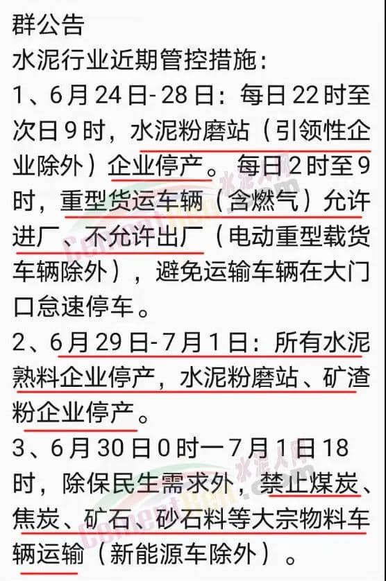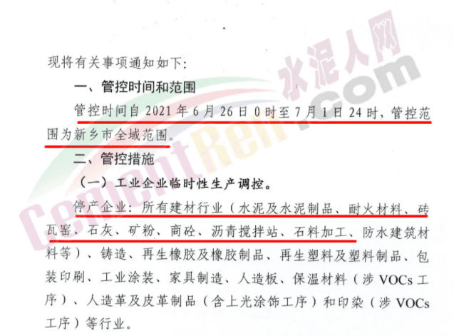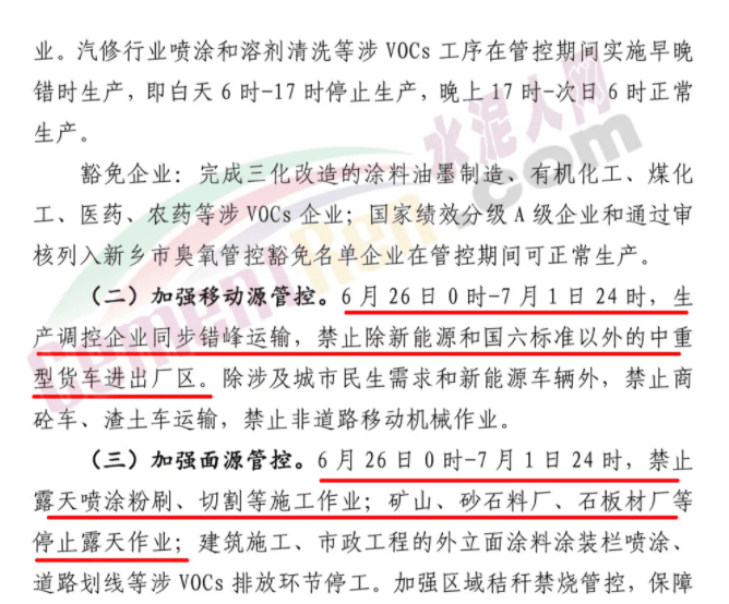 新鄉(xiāng)市全域范圍自6月26日0時至7月1日24時包括水泥及水泥制品在內的所有建材行業(yè)停產,生產調控企業(yè)同步錯峰運輸,禁止除新能源和國六標準以外的中重型貨車進出廠區(qū),礦山、砂石料廠、石板材廠等停止露天作業(yè)。