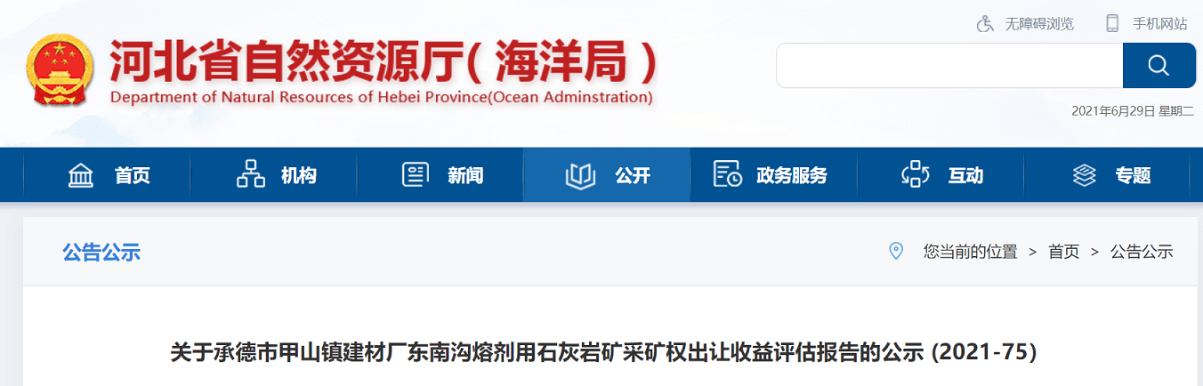 2021年6月28日,河北自然資源廳公示了承德市甲山鎮(zhèn)建材廠東南溝熔劑用石灰?guī)r礦采礦權(quán)出讓收益評估報告,如下: