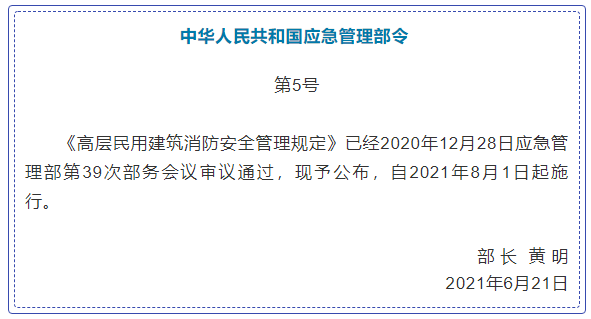 日前,應(yīng)急管理部發(fā)布《高層民用建筑消防安全管理規(guī)定》稱《高層民用建筑消防安全管理規(guī)定》已經(jīng)2020年12月28日應(yīng)急管理部第39次部務(wù)會議審議通過,現(xiàn)予公布,自2021年8月1日起施行。
