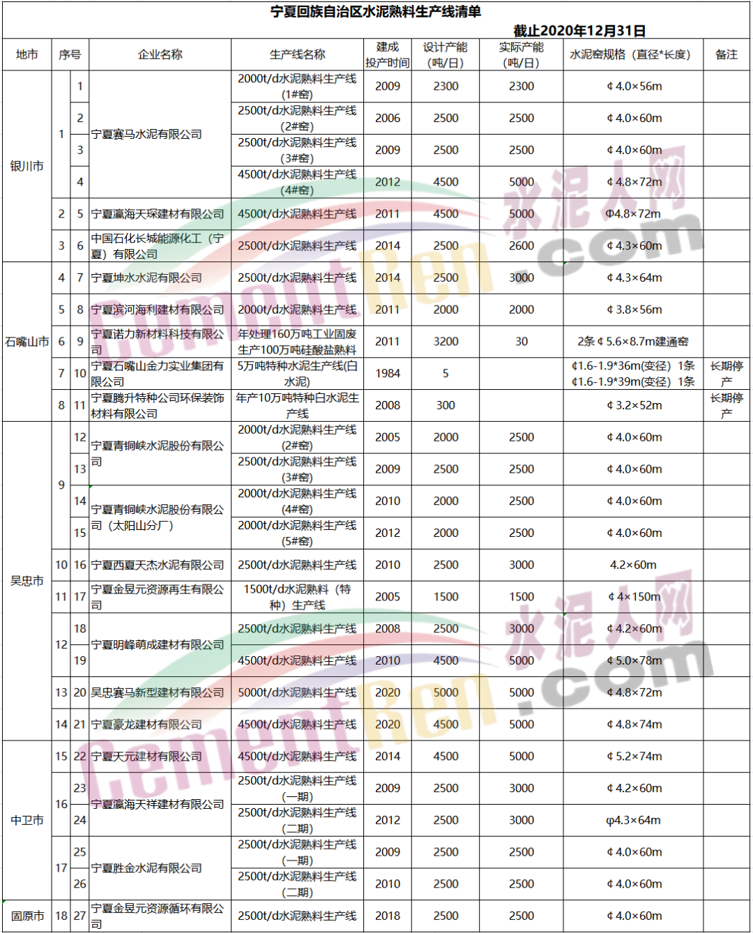 甘肅省水泥熟料生產(chǎn)線現(xiàn)狀清單