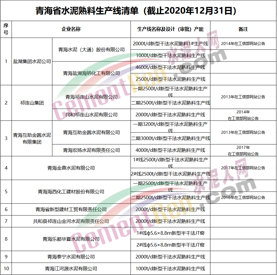 青海省水泥生產(chǎn)線清單中包括13家水泥公司,年產(chǎn)能總計共1179萬噸/年。