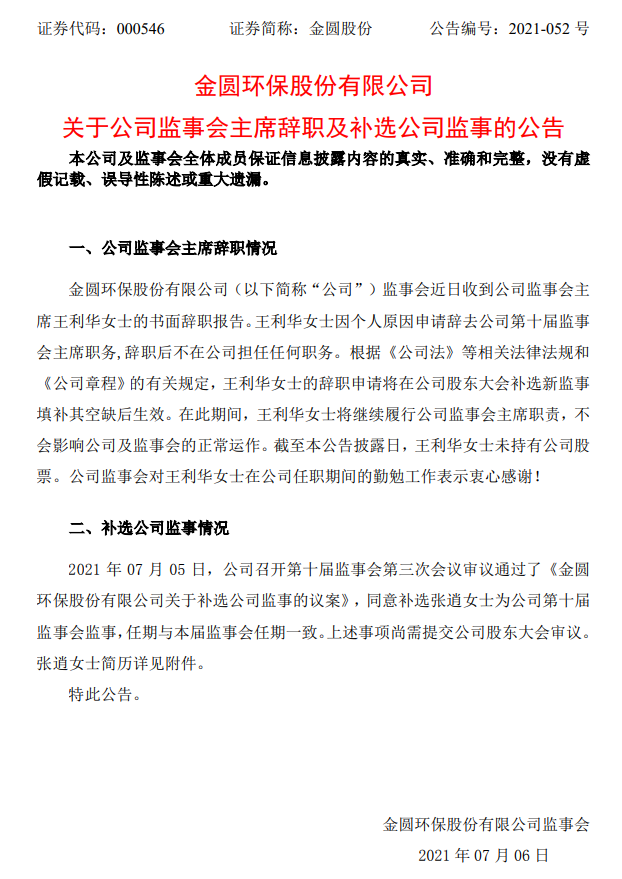 日前,金圓環(huán)保股份有限公司發(fā)布公告稱,金圓環(huán)保股份有限公司監(jiān)事會(huì)近日收到公司監(jiān)事會(huì)主席王利華女士的書面辭職報(bào)告。王利華女士因個(gè)人原因申請辭去公司第十屆監(jiān)事會(huì)主席職務(wù),辭職后不在公司擔(dān)任任何職務(wù)。