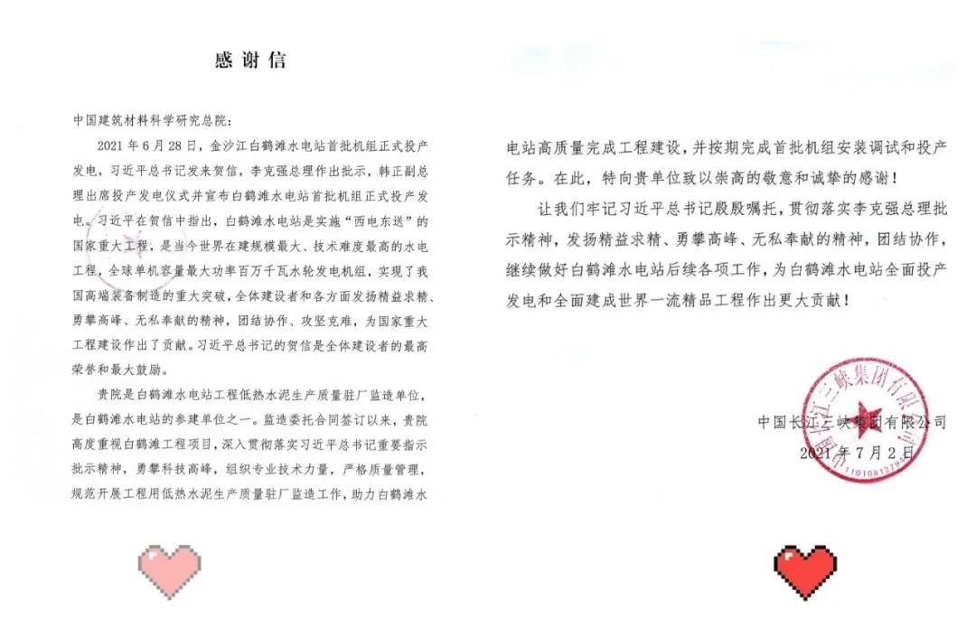 7月5日,中國(guó)建材集團(tuán)所屬中國(guó)建筑材料科學(xué)研究總院有限公司(以下簡(jiǎn)稱(chēng)“中國(guó)建材總院”)和嘉華特種水泥股份有限公司(以下簡(jiǎn)稱(chēng)“嘉華水泥”),分別收到了來(lái)自白鶴灘水電站開(kāi)發(fā)建設(shè)方中國(guó)長(zhǎng)江三峽集團(tuán)有限公司的感謝信。