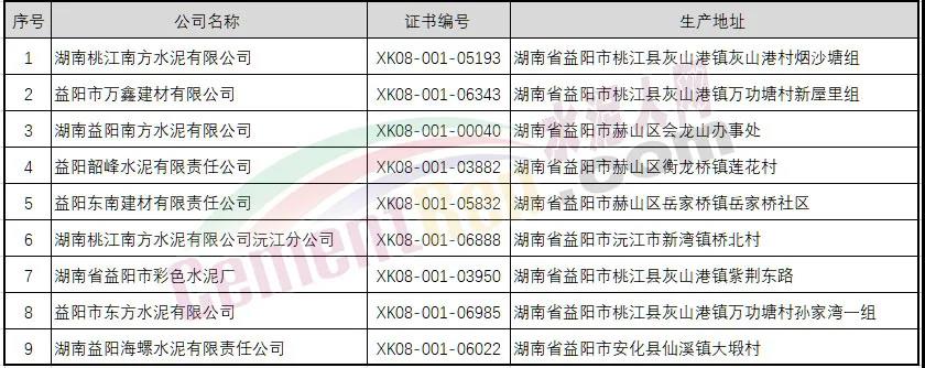 據(jù)市場(chǎng)監(jiān)管總局工業(yè)品生產(chǎn)許可證辦公室數(shù)據(jù)顯示,位于湖南益陽市的水泥生產(chǎn)企業(yè)共有包括南方水泥、海螺水泥子公司在內(nèi)的9家企業(yè)。