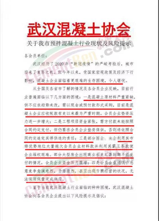 鑒于當前武漢混凝土行業(yè)面臨的種種困境,武漢混凝土協(xié)會向各會員企業(yè)提出以下風險提示及倡議∶