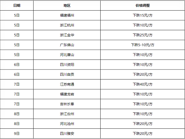 進入七月份,西南四川、華東江蘇、浙江、福建以及河北唐山、滄州、廣東佛山、東北吉林等多區(qū)域商混價格出現(xiàn)5-40元/方不等的下跌。