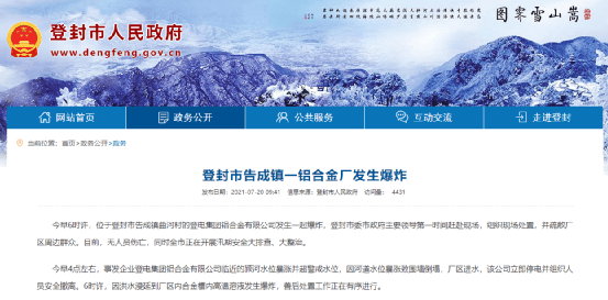 據(jù)人民網(wǎng)官方微博通報(bào),據(jù)登封發(fā)布,20日凌晨4點(diǎn)左右,事發(fā)企業(yè)登電集團(tuán)鋁合金有限公司臨近的潁河水位暴漲并超警戒水位,因河道水位暴漲致圍墻倒塌,廠區(qū)進(jìn)水,該公司立即停電并組織人員安全撤離。6時(shí)許,因洪水漫延到廠區(qū)內(nèi)合金槽內(nèi)高溫溶液發(fā)生爆炸,善后處置工作正在有序進(jìn)行。