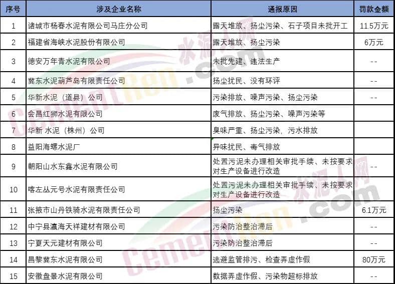 15家被通報(bào)水泥企業(yè)名單