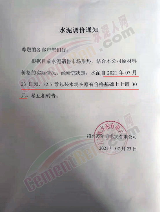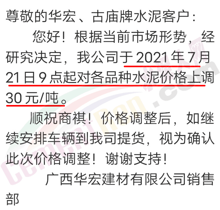 廣西華宏建材有限公司銷售部通知于2021年7月21日9點(diǎn)起對各品種水泥價格上調(diào)30元/噸。