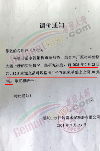 紹興山水回轉(zhuǎn)窯水泥粉磨有限公司通知,自7月23日起32.5水泥全品種規(guī)格出廠價在原基礎(chǔ)上上調(diào)30元/噸。