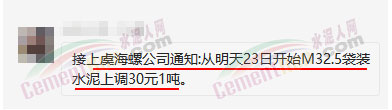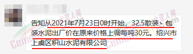 同期上虞區(qū)積山水泥、海螺水泥等通知從23日起上調(diào)32.5水泥價格30元/噸。