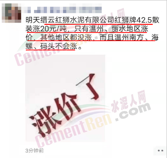浙江溫州、麗水紅獅、南方、海螺等企業(yè)集體漲價20元/噸