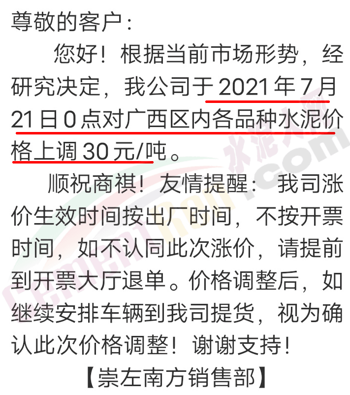 崇左南方銷售部通知于2021年7月21日0點(diǎn)對廣西區(qū)內(nèi)各品種水泥價格上調(diào)30元/噸。如不認(rèn)同此次漲價,請?zhí)崆暗介_票大廳退單。價格調(diào)整后,如繼續(xù)安排車輛提貨,視為確認(rèn)此次價格調(diào)整。