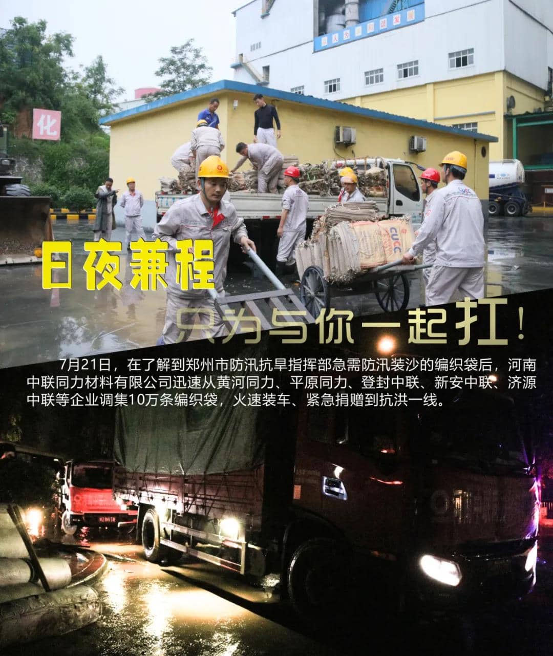 7月21日,得知鄭州市防汛抗旱指揮部,急需防汛裝沙編織袋的信息。根據(jù)中國聯(lián)合水泥防汛工作安排部署,河南中聯(lián)同力材料有限公司緊急組織登封中聯(lián)、新安中聯(lián)、濟源中聯(lián)、黃河同力、平原同力等企業(yè),第一時間籌集抗洪物資