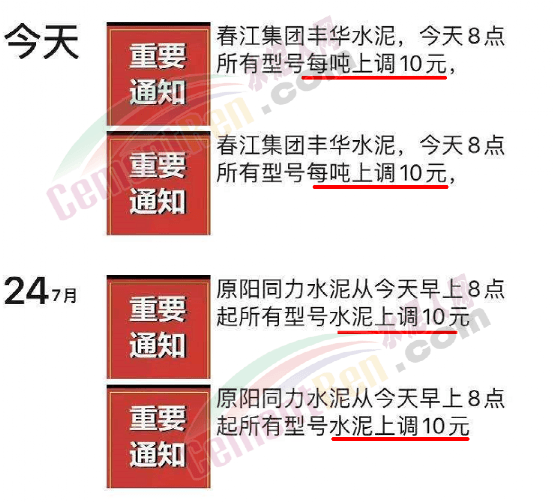 水泥人網(wǎng)通訊員消息,自24日原陽(yáng)同力通知上調(diào)所有型號(hào)水泥價(jià)格10元/噸后,昨日(26日)春江集團(tuán)豐華水泥也通知所有型號(hào)水泥上調(diào)10元/噸。