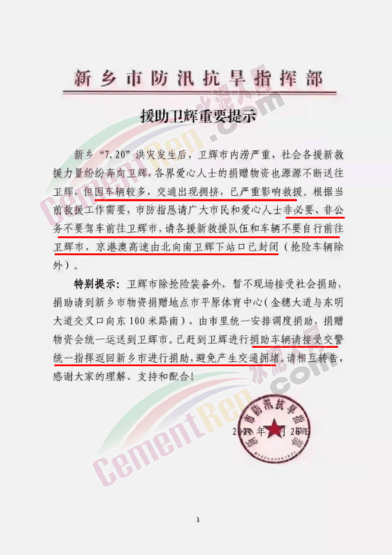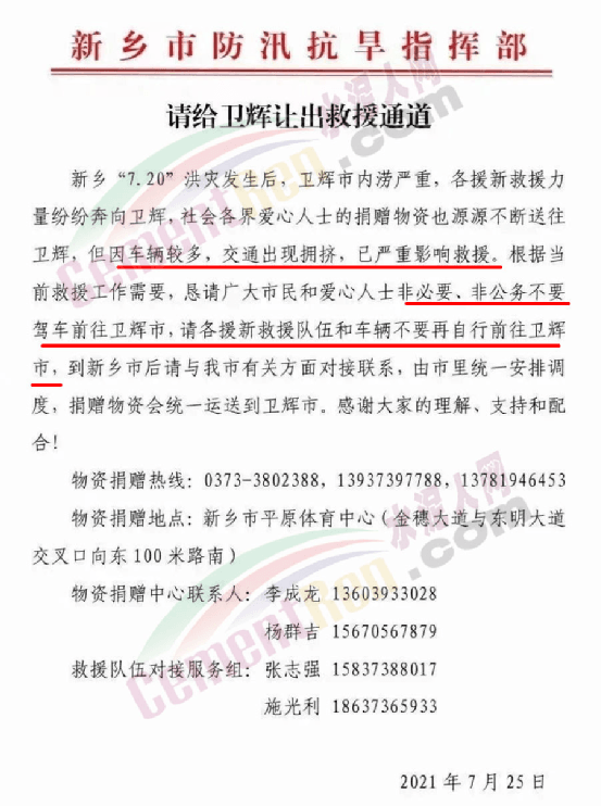 新鄉(xiāng)市防汛抗旱指揮部發(fā)出的《請(qǐng)給衛(wèi)輝讓出救援通道》中提到新鄉(xiāng)"7.20"洪災(zāi)發(fā)生后,衛(wèi)輝市內(nèi)澇嚴(yán)重,各援新救援力量紛紛奔向衛(wèi)輝,社會(huì)各界愛(ài)心人士的捐贈(zèng)物資也源源不斷送往衛(wèi)輝,但因車(chē)輛較多,交通出現(xiàn)擁擠,已嚴(yán)重影響救援。根據(jù)當(dāng)前救援工作需要,懇請(qǐng)廣大市民和愛(ài)心人士非必要、非公務(wù)不要駕車(chē)前往衛(wèi)輝市,請(qǐng)各援新救援隊(duì)伍和車(chē)輛不要再自行前往衛(wèi)輝市,到新鄉(xiāng)市后請(qǐng)與有關(guān)方面對(duì)接聯(lián)系,由市里統(tǒng)一安排調(diào)度,捐贈(zèng)物資會(huì)統(tǒng)一運(yùn)送到衛(wèi)輝市。