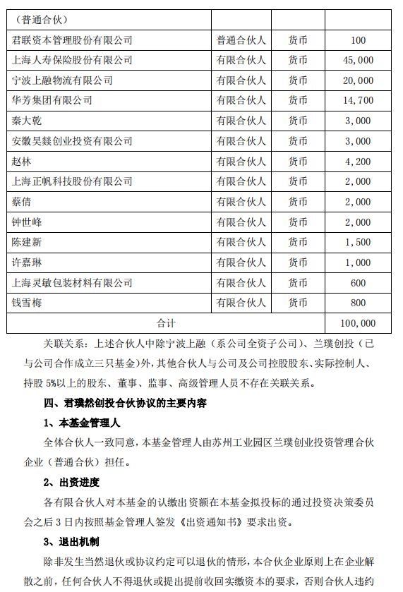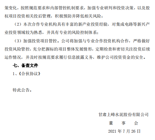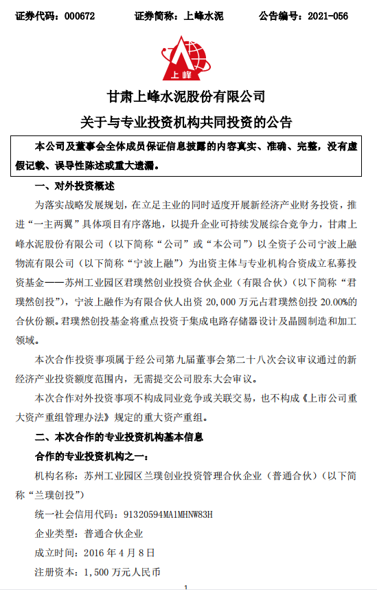 上峰水泥(000672)7月26日晚間公告,公司擬以全資子公司寧波上融物流有限公司(簡稱“寧波上融”)為出資主體與專業(yè)機構合資成立私募投資基金――蘇州工業(yè)園區(qū)君璞然創(chuàng)業(yè)投資合伙企業(yè)(有限合伙)(簡稱“君璞然創(chuàng)投”),寧波上融作為有限合伙人出資2億元占君璞然創(chuàng)投20.00%的合伙份額。君璞然創(chuàng)投基金將重點投資于集成電路存儲器設計及晶圓制造和加工領域。